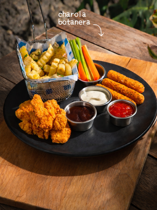 Pa' compartir: Boneless con tu salsa preferida, deditos de queso empanizados, papas a la fracesa, y mix de zanahoria, pepino y jícama. Con tu aderezo ranch, ¡Boom!